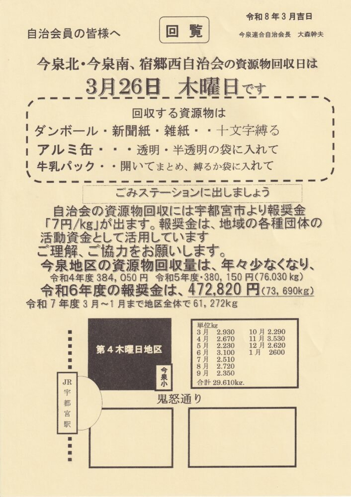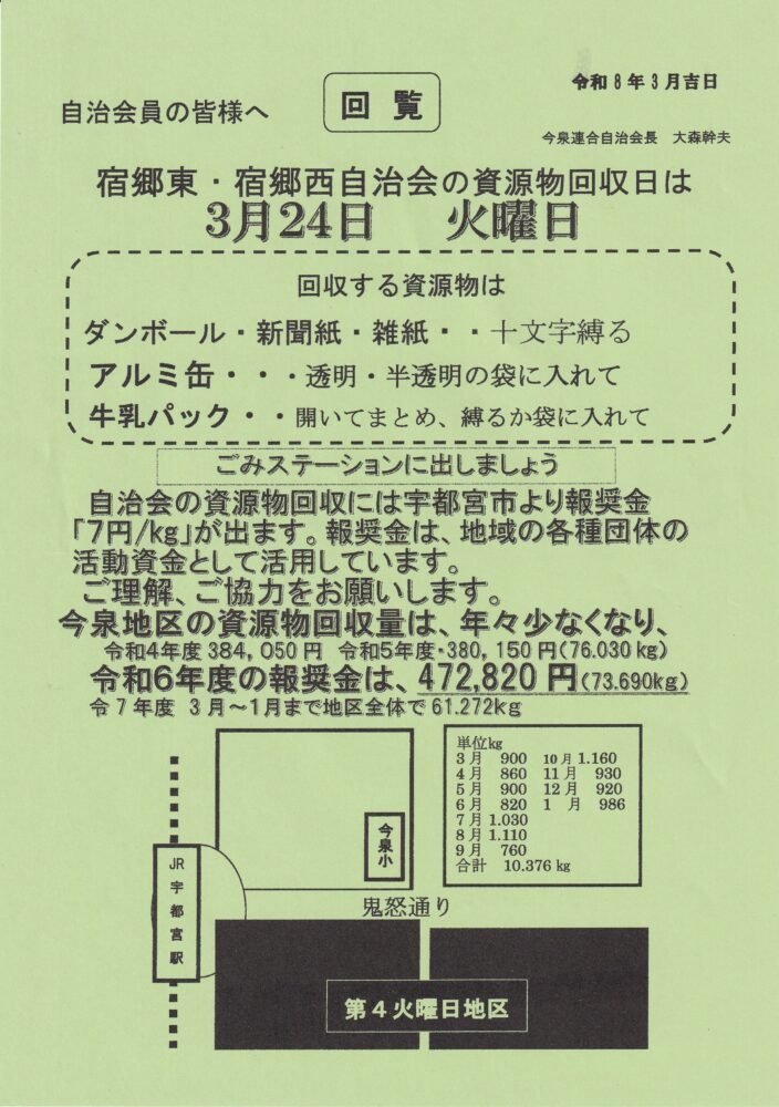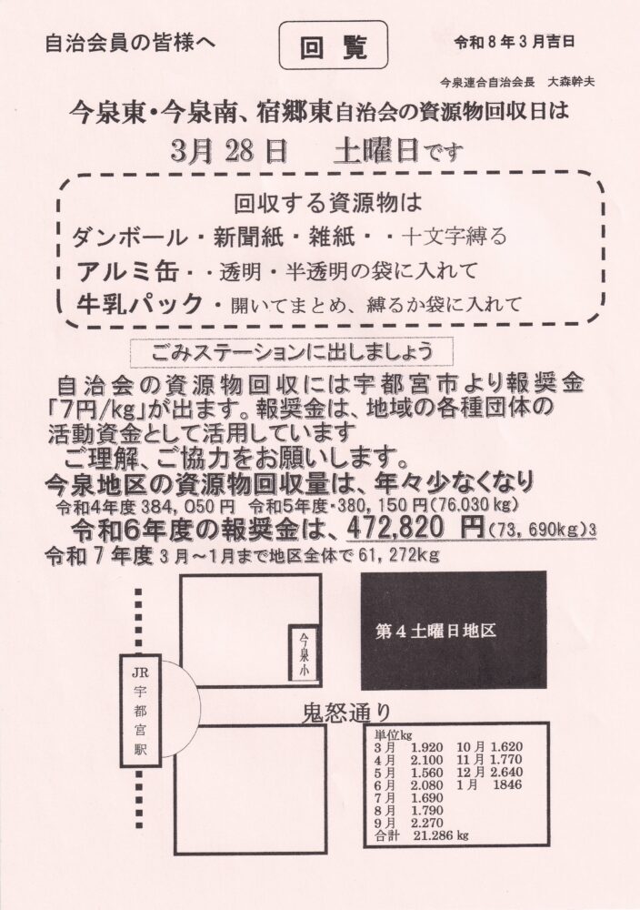 2026年3月のデジタル回覧版(3月2日更新) 2026 3/02 コミュニティ協議会 デジタル回覧板 今泉北自治会 今泉南自治会 今泉東自治会 宿郷東自治会 宿郷西自治会 2026年3月2日 R080324_資源物回収日_宿東_宿西ダウンロード R080326_今北_今南_宿西ダウンロード R080328_資源物回収日_今東_今南_宿東ダウンロード コミュニティ協議会 デジタル回覧板 今泉北自治会 今泉南自治会 今泉東自治会 宿郷東自治会 宿郷西自治会 よかったらシェアしてね! URLをコピーしました! URLをコピーしました! 令和8年2月16日(お花を楽しむ会より)「リース」作り 関連記事 防災庫の整備を行いました(「そなえる・ささえる」特別助成事業) 2026年3月2日 今泉地区の歩け歩け大会のご報告 2026年2月12日 2026年2月のデジタル回覧版(2月7日更新) 2026年2月6日 令和8年2月 今泉小学校屋内運動場改築工事のおしらせ 2026年2月6日 健康アップ交流アップ大会開催について 2026年1月31日 今泉地区防災講座のお知らせ 2026年1月31日 令和8年1月24日(土) 青少年育成協議会 研修会開催のおしらせ 2026年1月19日 2026年1月のデジタル回覧板(1月31日更新) 2026年1月10日